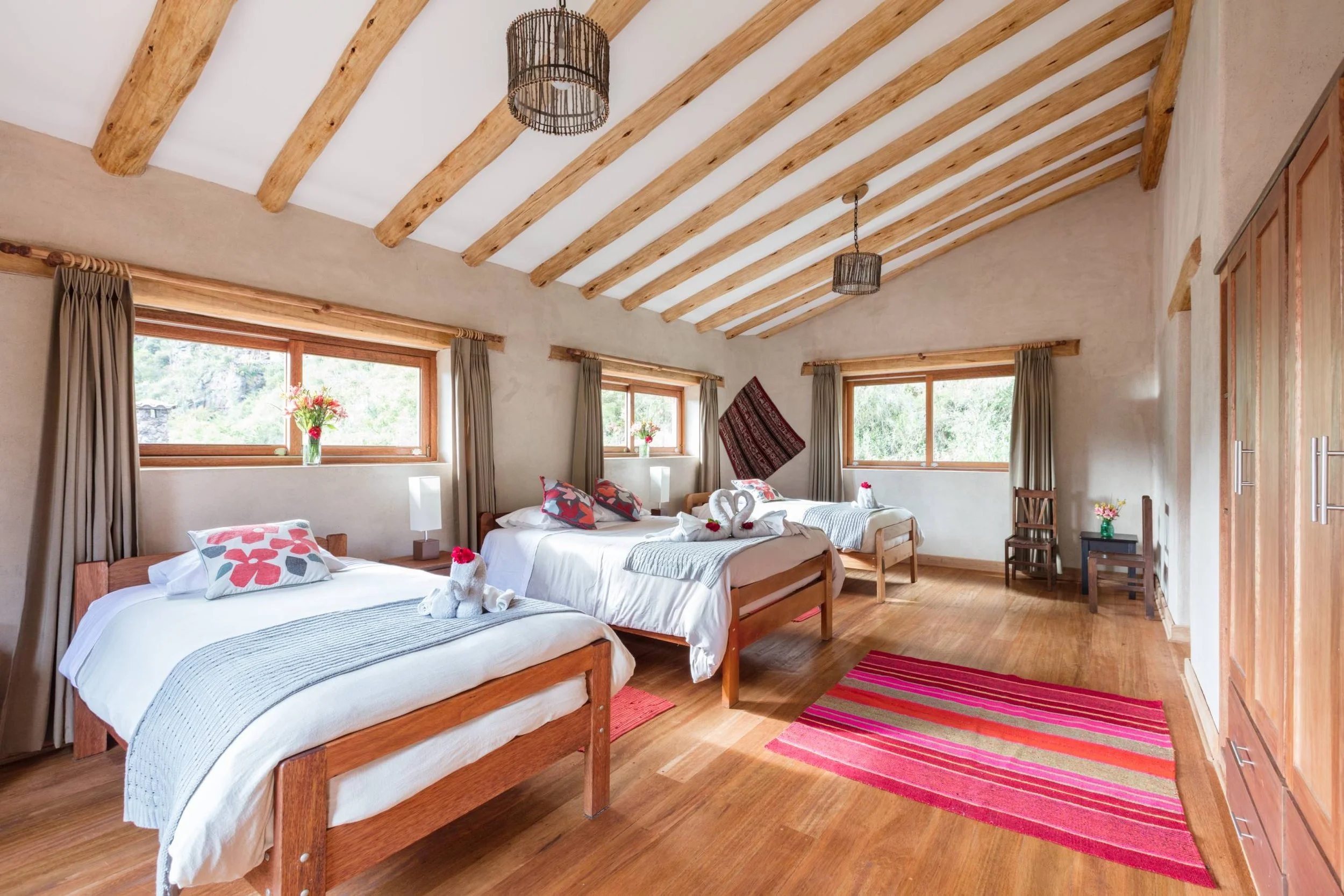 5 nights of triple-room shared accommodations. There is a large private dinning area for the group with a chef and a kitchen team, as well as relaxing spaces with a fireplace, decks to overview the Sacred Mountains, and gardens. Option for single and double private rooms are available.