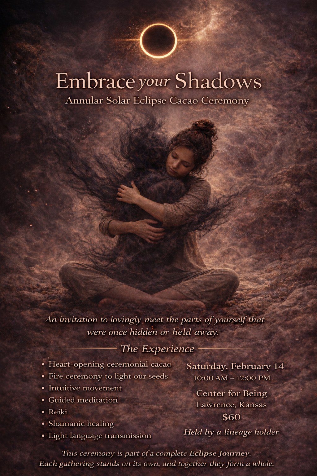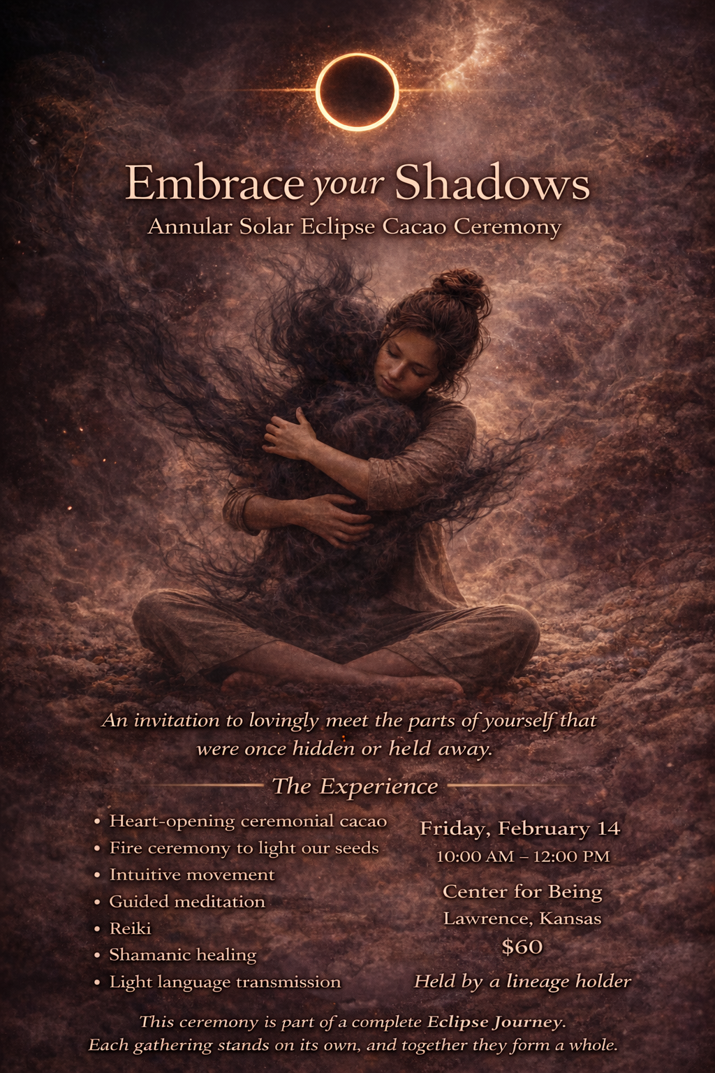 Saturday February 14th: Embrace Your Shadows Annular Solar Eclipse Cacao Ceremony in Lawrence, Kansas.