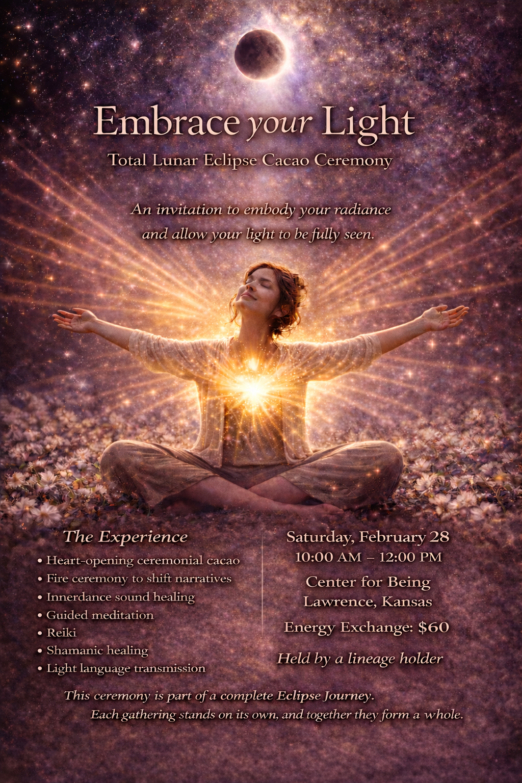 Saturday February 28th: Embrace Your Light Total Lunar Eclipse Cacao Ceremony in Lawrence, Kansas.