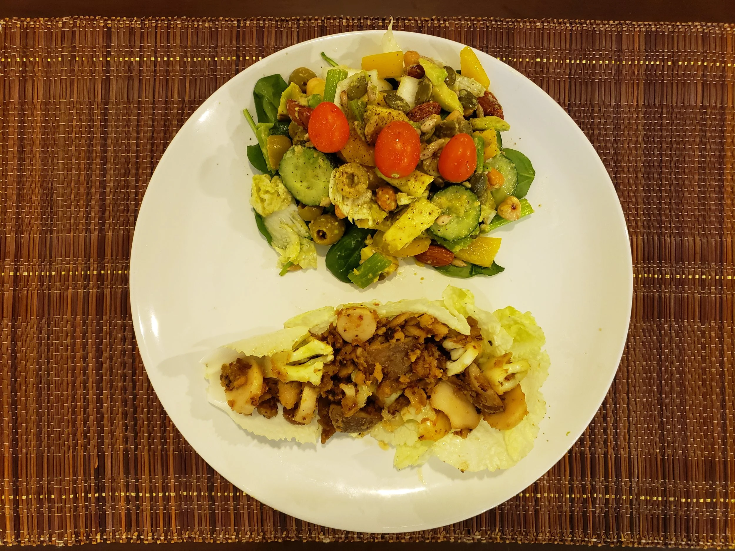 I also made sautés mushrooms mixed with some vegan meat and the steam of the cauliflower that I had from making the Cauliflower Mashed Potatoes. I just put some sesame seed oil, salt and pepper. Served on Chinese cabbage? Some lettuce looking thing. Lol VOILÀ! Lunch was perf! 😊