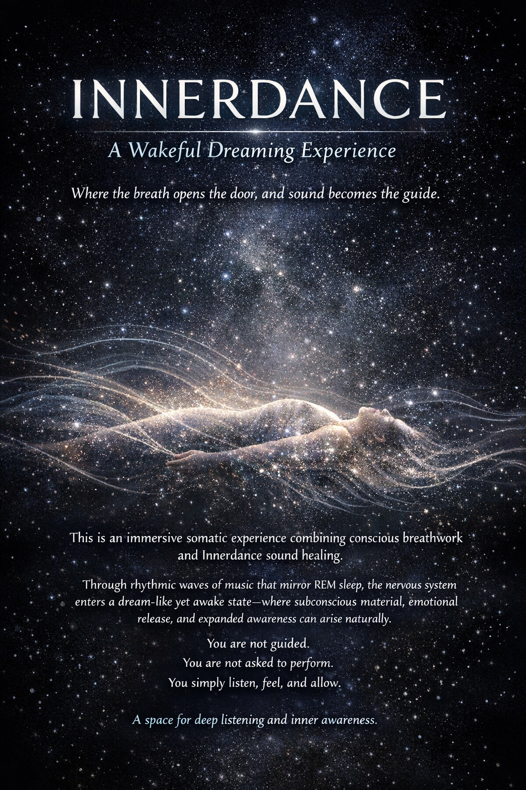Innerdance is a profound, energy intensive and often life changing experience. It connects participants to collective energies as well as the deeply personal energies of our unique inner worlds. We will start with the breath, a Somatic Experience to cleanse your energetic bodies as well as the physical in order to experience more during the soundscape.